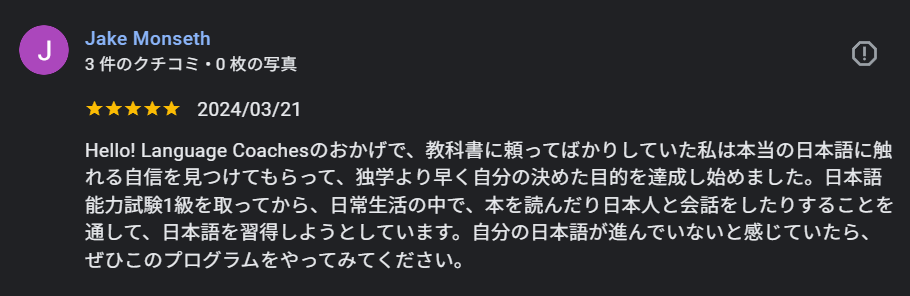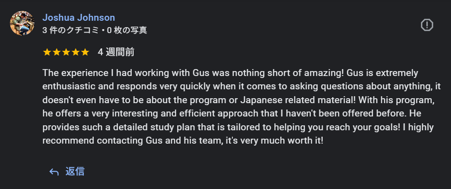 "I had just failed the N3 exam actually in July when I reached out to join this program. But I was inspired by my colleagues who reached N1, so I signed up for the JLPT N1 test in December. I wasn't sure if I could even pass the test --- but thanks to this program I was able to stay consistent and get the direction I needed. I passed the test, which allowed me to land my next job in Japan!"